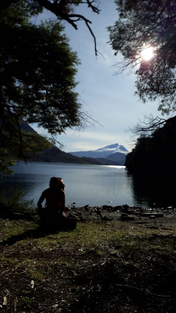 Luego de 2 horas más, arribamos al Lago Mascardi y encontramos una playita para almorzar y tomar unos mates, mientras disfrutamos la soledad de este sector del Parque Nahuel Huapi que nos regala vistas del tronador y enfrente el cerro Capitán Diego de Leon.