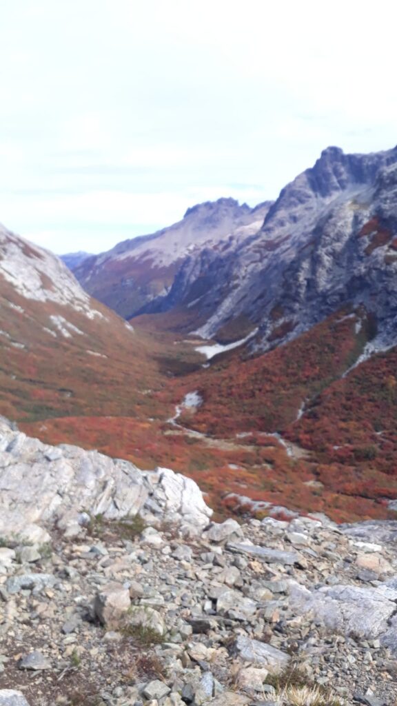 Almorzamos y realizamos un descanso al lado de la laguna Jakob mientras nos preparamos a continuar hacia la Laguna de los Témpanos y el paso Schweitzer donde tenemos un paisaje muy impactante de montaña y ya con vistas al valle del arroyo casalata. Los colores ya nos envuelven y nos empujan a continuar caminando este trekking que si bien está en muy buen estado no es muy frecuentado por los visitantes de Bariloche.